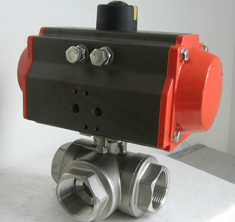 氣動三通球閥分L型和T型,介質流通方向見下圖。L型氣動三通球閥適用于介質流向的切換,能使相互垂直的兩個通道連通:T型氣動三通球閥適用于介質的分流、合流或流向 切換,T型孔道可以使三個通道互相連通或使其中兩個通道連通,氣動三通球閥一般采用三個閥座結構,亦可根據用戶要求采用四閥座結構。