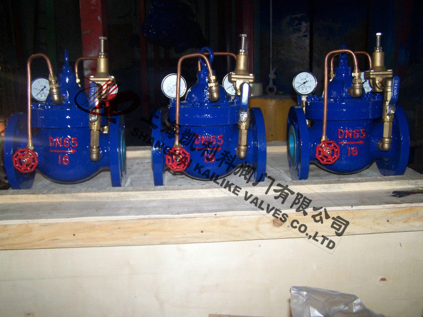 900X緊急關閉閥當出口壓力低于導閥設定的壓力時,導閥此時處于開通狀態,主閥上腔壓力與主閥出口壓力相等,進口與吃口存在壓差,水流經閥口出口流出,當消防泵氣泵時,或變平泵壓力升高時,超過導閥設定壓力,由主閥進口向導閥管控制室壓力升高,作用在彈簧壓力增大,向下壓緊,帶動閥芯下移,使導閥關閉,此時主閥進口壓力通過節流閥補充到主閥閥蓋上腔,因閥瓣受到向下壓力大于向上推力,主閥關閉。值得注意的是,進口壓力小于設定壓力是,主閥處于開啟狀態,進口壓力大于設定壓力,閥瓣關閉。